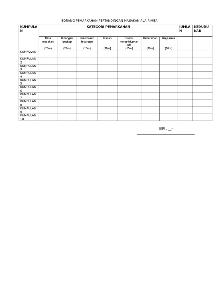 Borang pemarkahan pertandingan memasak perkhemahan sk lktp bukit bading bil perkara markah penuh markah diperolehi 1. Borang pemarkahan an memasak by carlynn_6674 sn:38164535. Jawaban yang saya kasih adalah teknik. Doc borang pemarkahan pertandingan deklamasi sajak bulan kemerdekaan sempena ulang tahun kemerdekaan negara ke 57 sekolah kebangsaan pasir besar 73420 gemas negeri sembilan farah farhana academia edu. Borang pemarkahan pertandingan memasak 1 docx.