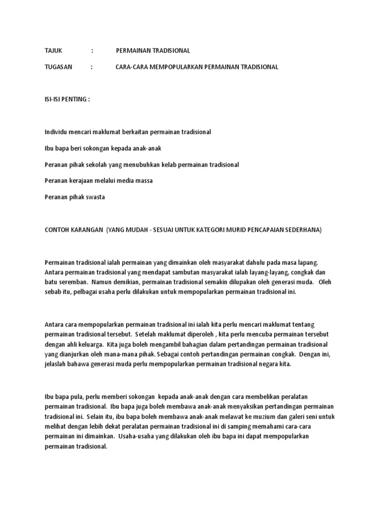 Contoh Karangan Permainan Tradisional from imgv2-1-f.scribdassets.com Maka, mereka akan merujuk kepada media massa yang mudah dan ringkas bagi mereka untuk mempelajari dan mengetahui tentang cara permainan congkak ataupun batu seremban yang mereka jumpai. Seterusnya, langkah untuk mempopularkan semula permainan tradisional adalah dengan memperkasa pertandingan permainan tradisional di setiap peringkat. Permainan tradisional adalah salah satu warisan dan budaya bangsa yang perlu dipelihara dan diraikan agar tidak tenggelam akibat kemodenan serta kehadiran teknologi hari ini. Selain itu, golongan muda hari ini perlu dibawa ke muzium atau pameran permainan tradisional bagi membuka mata mereka terhadap keunikan yang dimiliki oleh masyarakat kita. Permainan tradisional masih lagi dimainkan oleh sekumpulan kecil masyarakat yang duduk di kampung atau desa. Sejak dua tiga dekad ini, dapat kita saksikan betapa permainan tradisional semakin ditelan zaman seiring dengan arus pemodenan masa kini. Era pasca perindustrian dan pasca globalisasi yang serba mencabar akal dan minda kita telah menyebabkan permainan tradisional semakin dilupakan dek ditelan zaman. See full list on ipendidikan.my