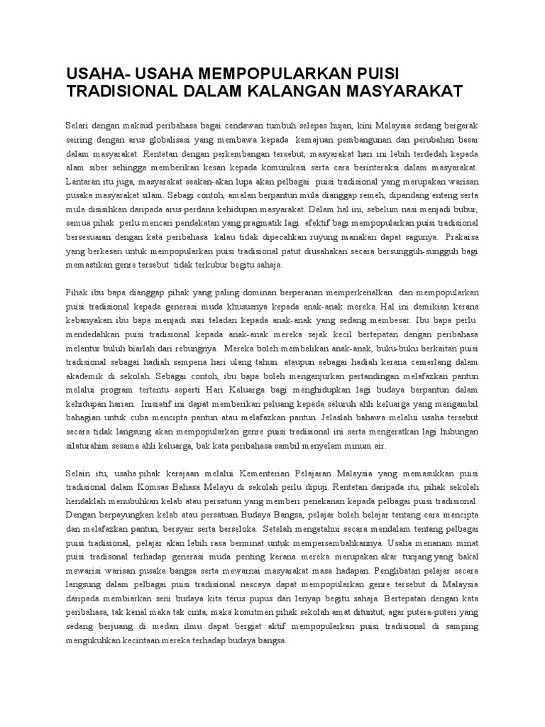 Jan 21, 2013 · usaha menanam minat terhadap generasi muda penting kerana mereka merupakan akar tunjang yang bakal mewarisi warisan pusaka bangsa serta mewarnai masyarakat masa hadapan, justeru, penglibatan pelajar secara langsung dalam permainan tradisional nescaya dapat mempopularkan permainan tersebut di malaysia daripada pupus dan lenyap begitu sahaja. Semoga setiap di antara kita sedar dan melakukan sesuatu bagi memastikan generasi akan datang mengetahui dan memelihara keunikan budaya dan warisan mereka tanpa ditelan arus kemajuan dunia. Karangan bahagian a permainan tradisional merupakan warisan bangsa yang tak lapuk dek hujan, tak lekang dek panas walaupun popularitinya semakin berkurangan. Permainan tradisional adalah salah satu warisan dan budaya bangsa yang perlu dipelihara dan diraikan agar tidak tenggelam akibat kemodenan serta kehadiran teknologi hari ini. Di samping itu, inisiatif yang wajar untuk dilaksanakan adalah dengan memberikan dana secara konsisten kepada penggiat permainan tradisonal di seluruh negara. Antara faedahnya ialah permainan ini dapat dijadikan produk pelancongan yang menguntungkan negara. Seterusnya, langkah untuk mempopularkan semula permainan tradisional adalah dengan memperkasa pertandingan permainan tradisional di setiap peringkat. Aug 07, 2018 · permainan tradisional dapat ditakrifkan secara literal sebagai permainan budaya yang sudah diamalkan oleh sesuatu masyarakat untuk satu tempoh tertentu. Maka, mereka akan merujuk kepada media massa yang mudah dan ringkas bagi mereka untuk mempelajari dan mengetahui tentang cara permainan congkak ataupun batu seremban yang mereka jumpai. Sebuah kelab permainan tradisional boleh diwujudkan bagi mengesan pelajar yang mempunyai bakat terpendam dalam permainan tradisional. Permainan tradisional merupakan permainan lama atau warisan yang diperturunkan dari genersi ke generasi sejak zaman nenek moyang kita.antara contoh permainan tradisional adalah seperti wau,gasing,congkak dan sepak raga.era pembangunan. More images for karangan usaha mempopularkan permainan tradisional » Akhir sekali, media massa juga berperanan untuk mempopularkan semula permainan tradisional yang kian dilupakan.