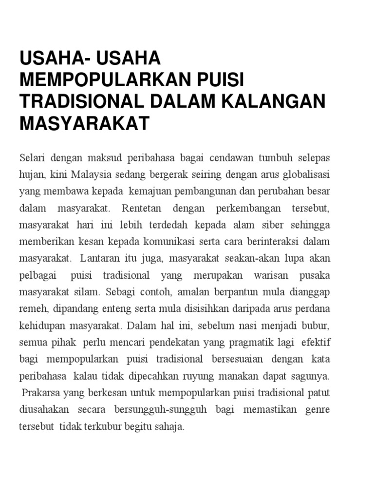 Usaha Usaha Mempopularkan Permainan Tradisional from imgv2-1-f.scribdassets.com Oleh itu, inisiatif yang boleh digarap adalah dengan memperbanyakkan dokumentasi tentang permainan tradisional. Usaha ini merupakan peranan ibu, bapa dan ahli keluarga dalam memberikan tauladan kepada generasi yang baru setahun jagung bahawa bermain permainan tradisional juga menghiburkan. Sebuah kelab permainan tradisional boleh diwujudkan bagi mengesan pelajar yang mempunyai bakat terpendam dalam permainan tradisional. Selain itu, golongan muda hari ini perlu dibawa ke muzium atau pameran permainan tradisional bagi membuka mata mereka terhadap keunikan yang dimiliki oleh masyarakat kita. See full list on ipendidikan.my Selain di rumah, sekolah juga boleh memainkan peranan dalam memperkenalkan permainan tradisional kepada pelajar. Peribahasa melayu berkata, melentur buluh biarlah dari rebungnya. Stesen televisyen, media cetak dan media elektronik merupakan medium penyampai yang utama kepada masyarakat hari ini.